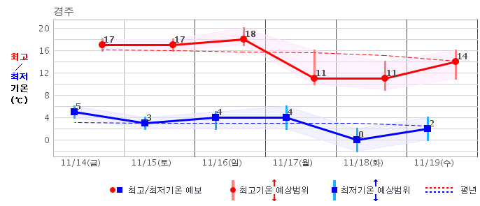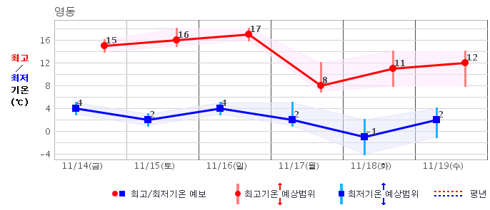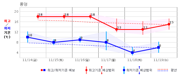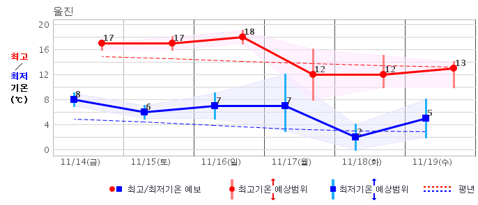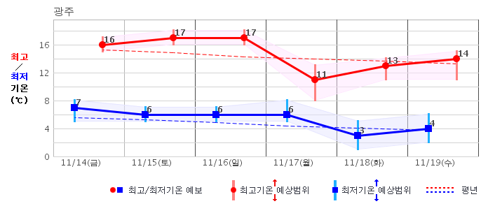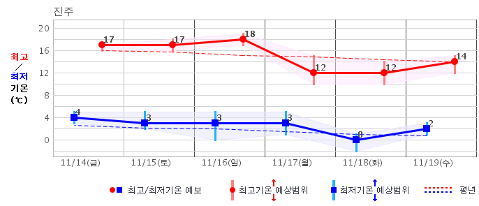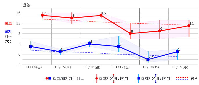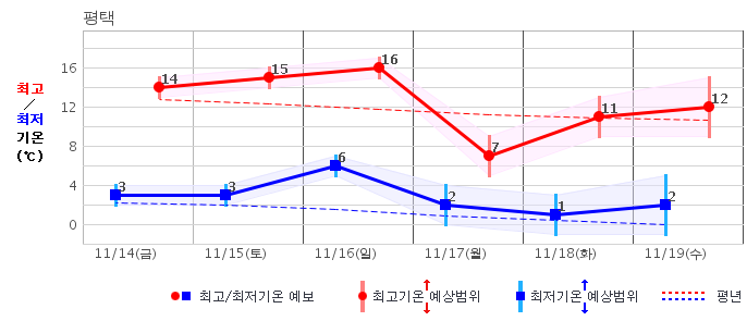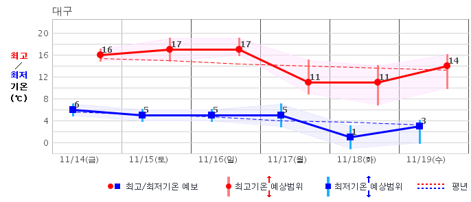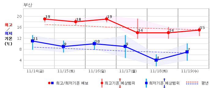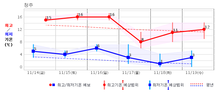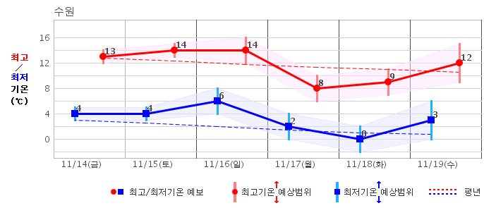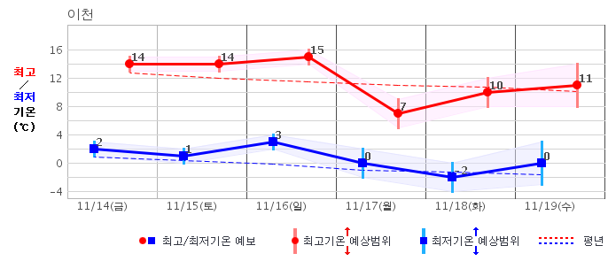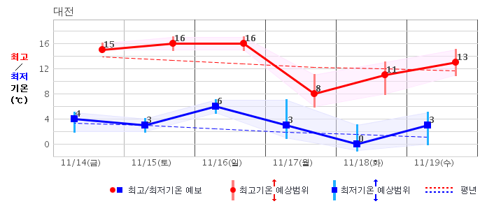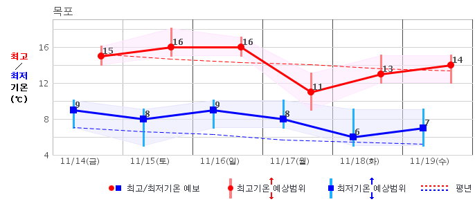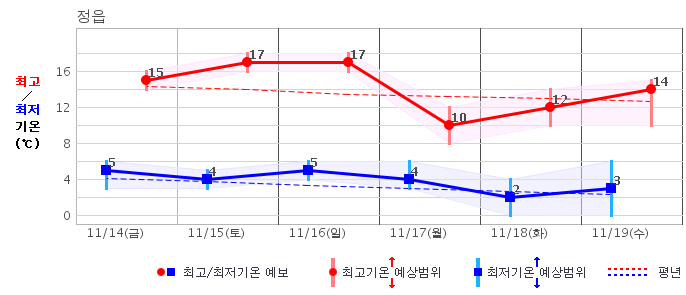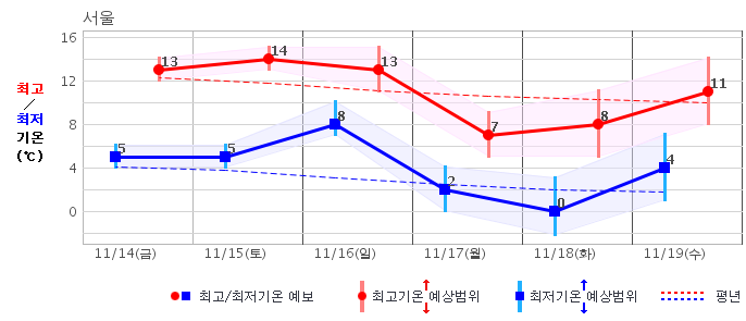 ○ (하늘상태) 이번 예보기간에는 전국이 대체로 맑은 날이 많겠으나, 16일(일)~17일(월) 전국이 구름많겠습니다. ○ (기온) 14일(금)~16일(일) 아침 기온은 1~11℃, 낮 기온은 12~19℃로 평년(최저기온 -1~9℃, 최고기온 9~17℃)과 비슷하거나 조금 높겠으나, 17일(월)~19일(수) 아침 기온은 -3~9℃, 낮 기온은 6~15℃로 평년과 비슷하거나 조금 낮겠습니다.
