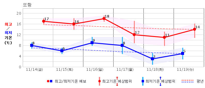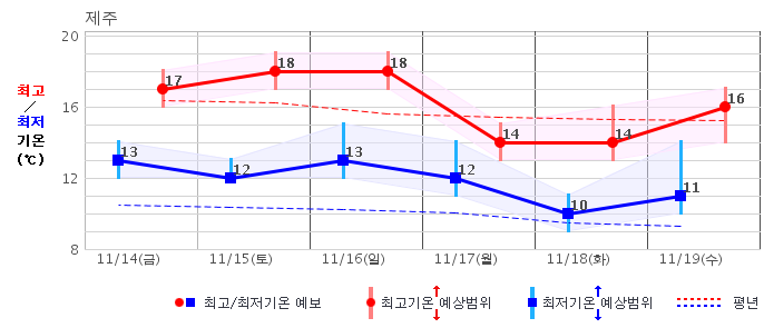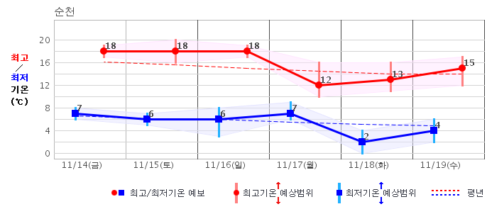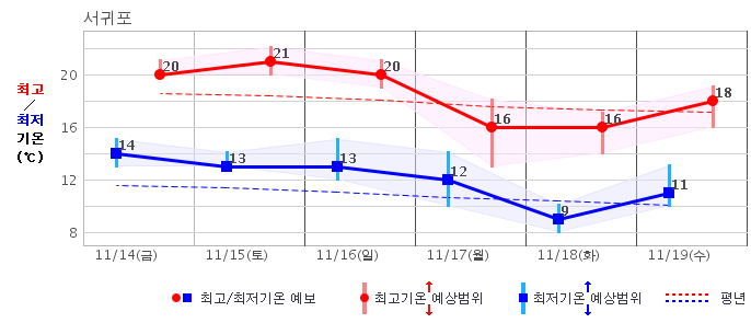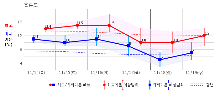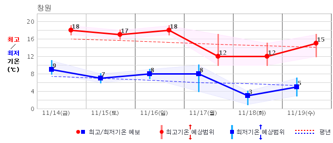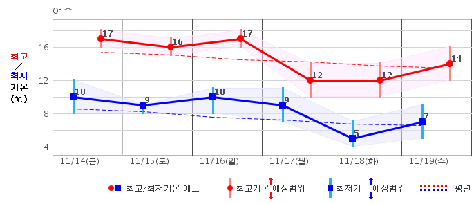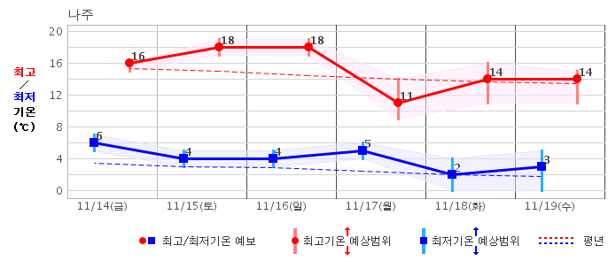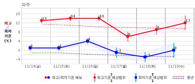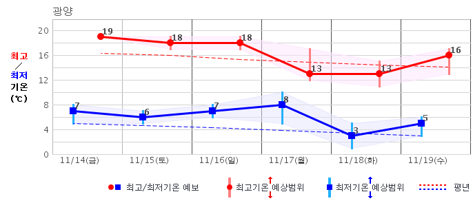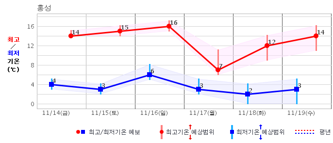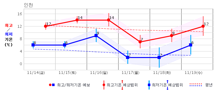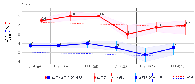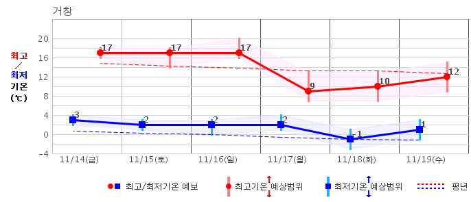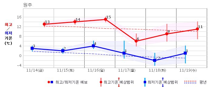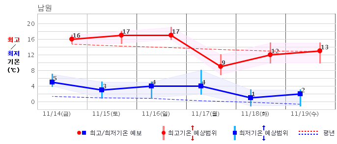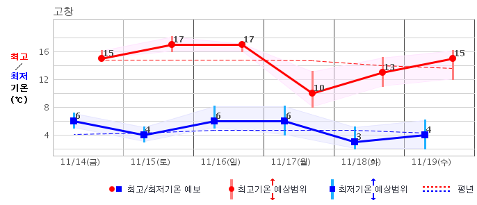 ○ (하늘상태) 이번 예보기간에는 전국이 대체로 맑은 날이 많겠으나, 16일(일)~17일(월) 전국이 구름많겠습니다. ○ (기온) 14일(금)~16일(일) 아침 기온은 1~11℃, 낮 기온은 12~19℃로 평년(최저기온 -1~9℃, 최고기온 9~17℃)과 비슷하거나 조금 높겠으나, 17일(월)~19일(수) 아침 기온은 -3~9℃, 낮 기온은 6~15℃로 평년과 비슷하거나 조금 낮겠습니다.