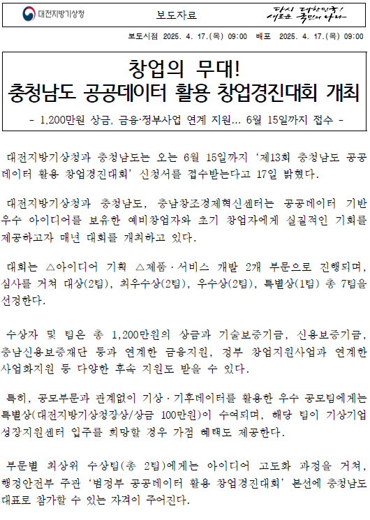 ★ 제13회 충남 공공데이터 활용 창업경진대회 개최 보도자료_최종.pdf (크기:0.687MB , 다운로드:219)