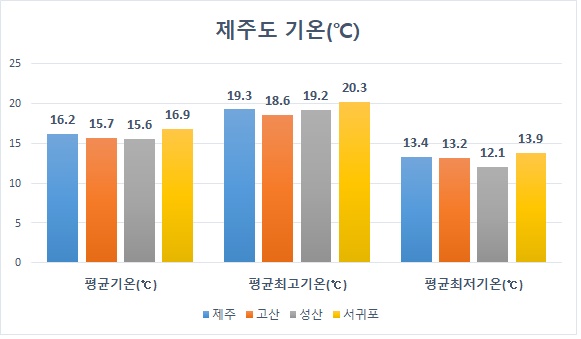 제주도는 수리적 위치, 난류의 영향, 섬 등의 이유로 해양성기후를 나타낸다. 기온의 연교차나 일교차가 육지에 비하여 작으며 해륙풍의 발생빈도가 높고 주위