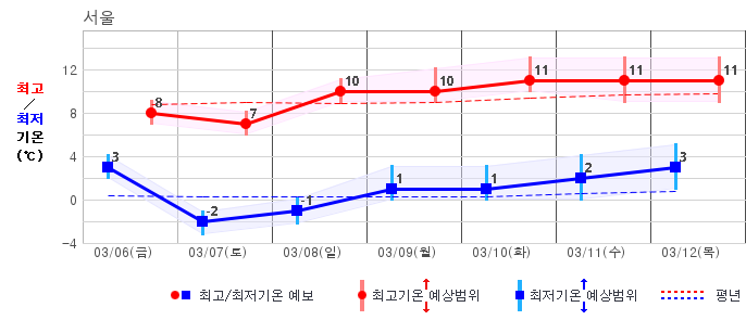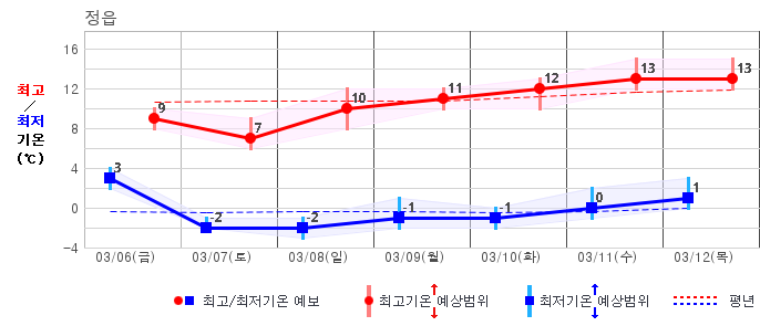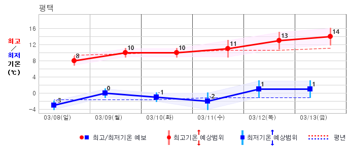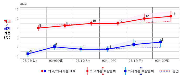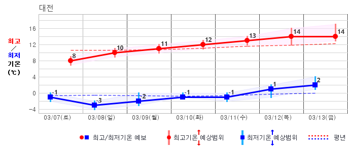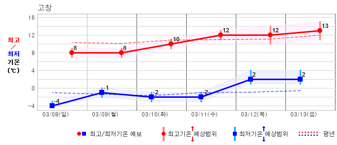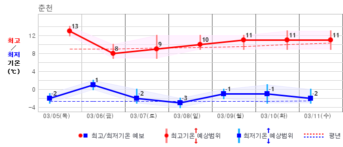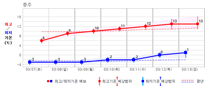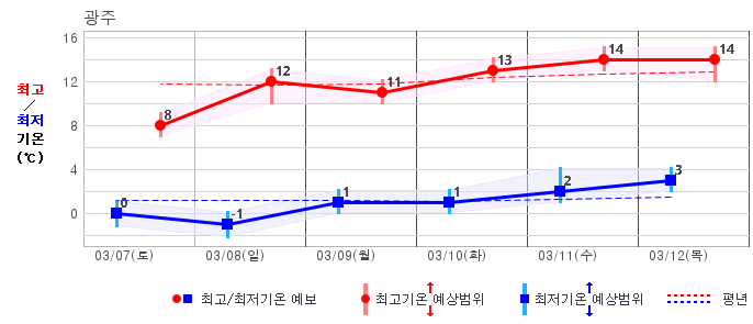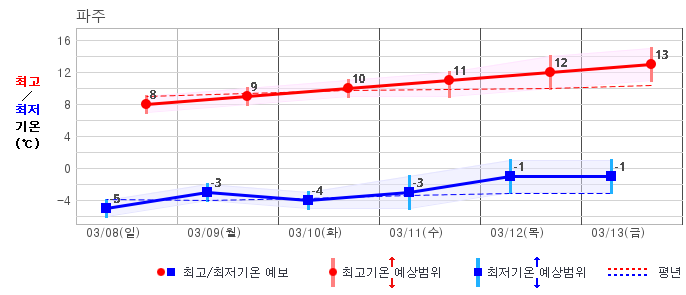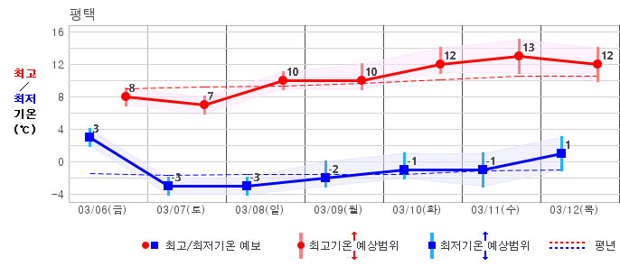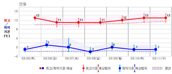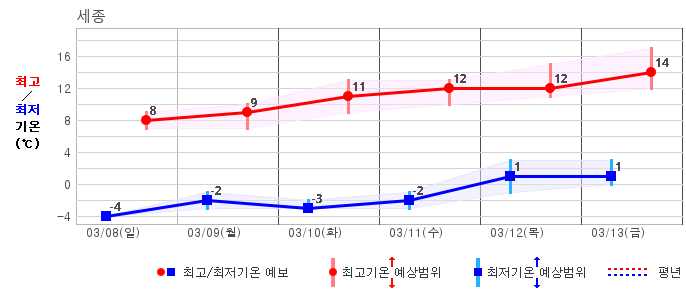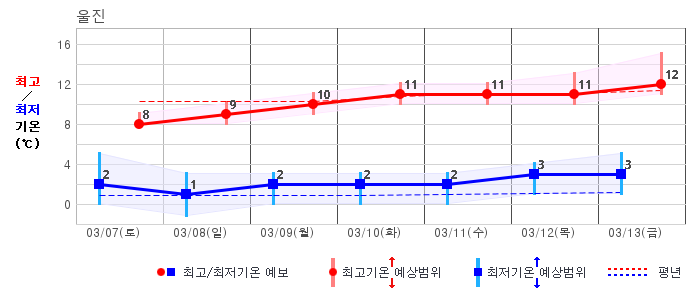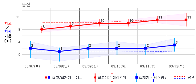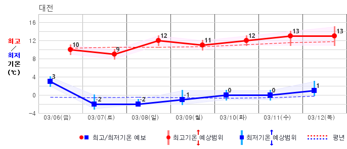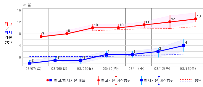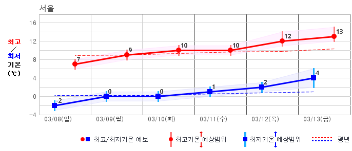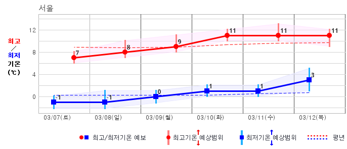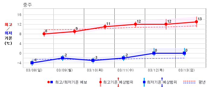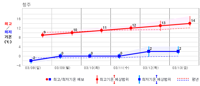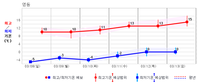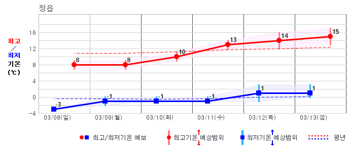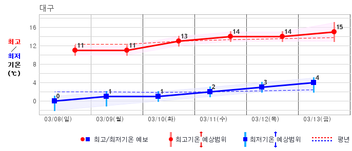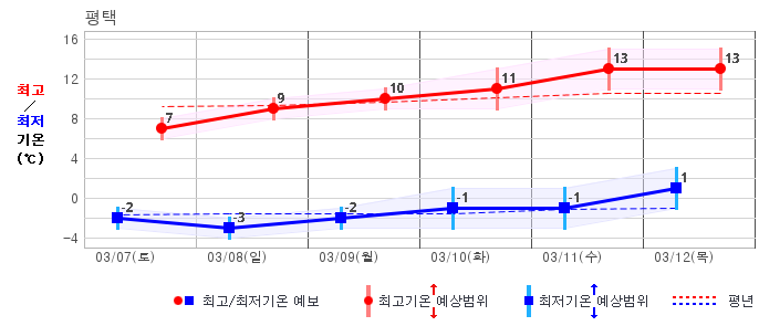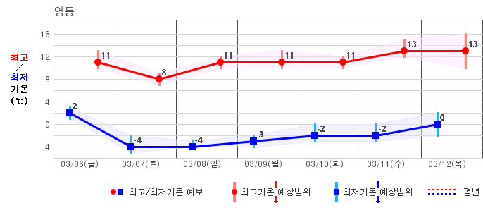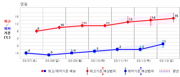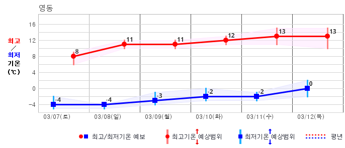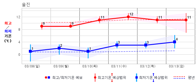 ○ (기온) 이번 예보기간 아침 기온은 -8~5℃, 낮 기온은 3~13℃로 평년(최저기온 -8~2℃, 최고기온 3~10℃)과 비슷하거나 조금 높겠습니다.