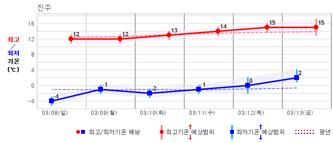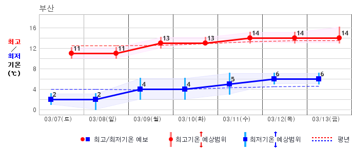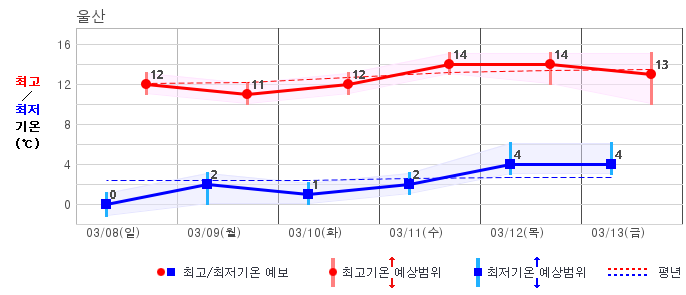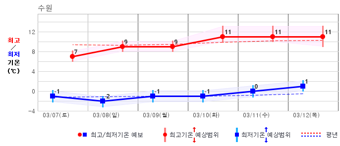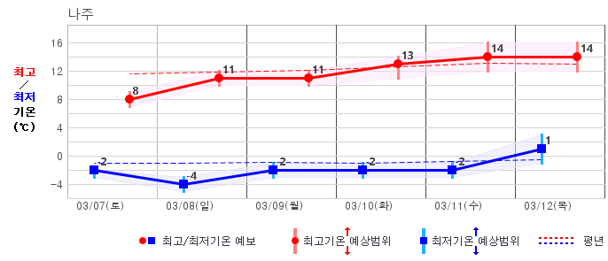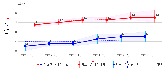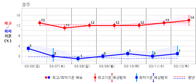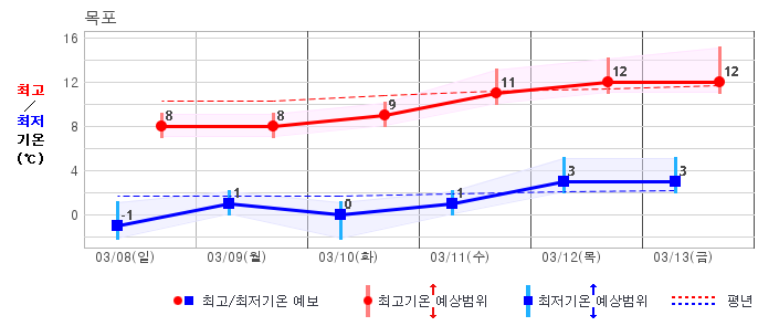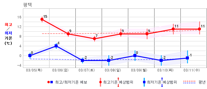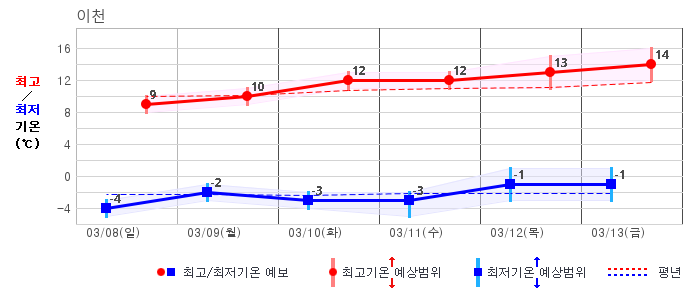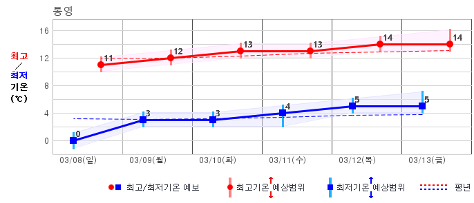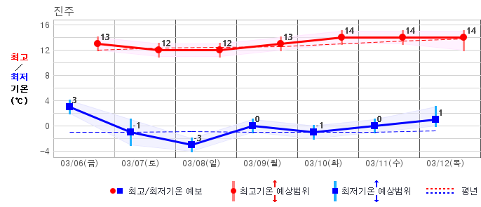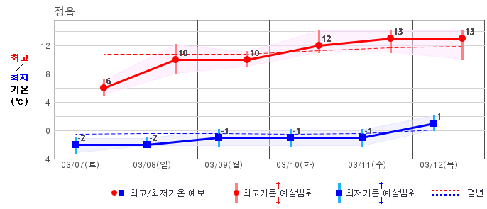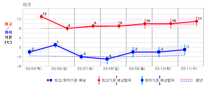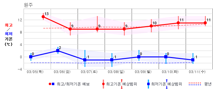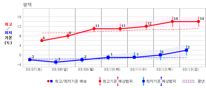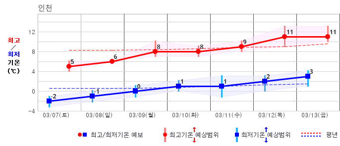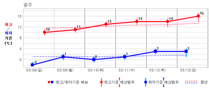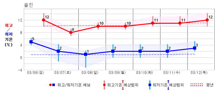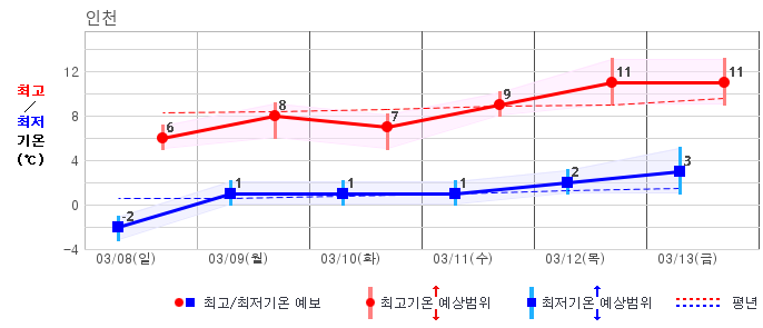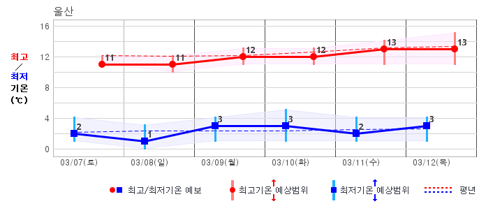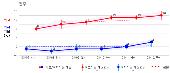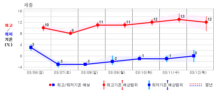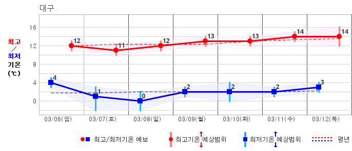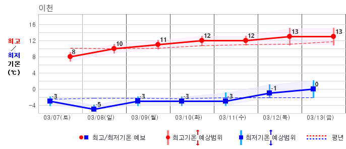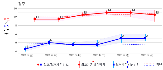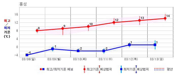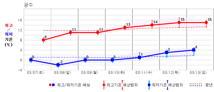 ○ (기온) 이번 예보기간 아침 기온은 -8~5℃, 낮 기온은 3~13℃로 평년(최저기온 -8~2℃, 최고기온 3~10℃)과 비슷하거나 조금 높겠습니다.