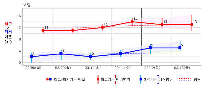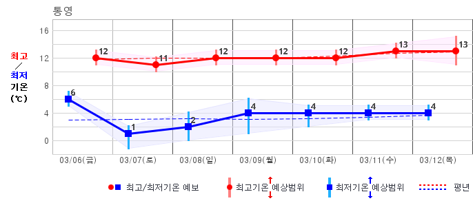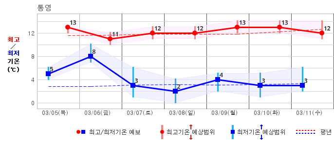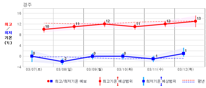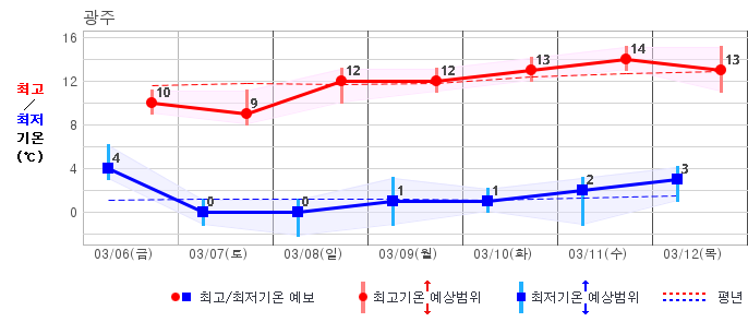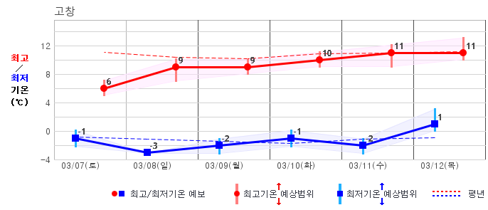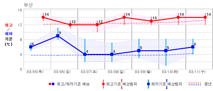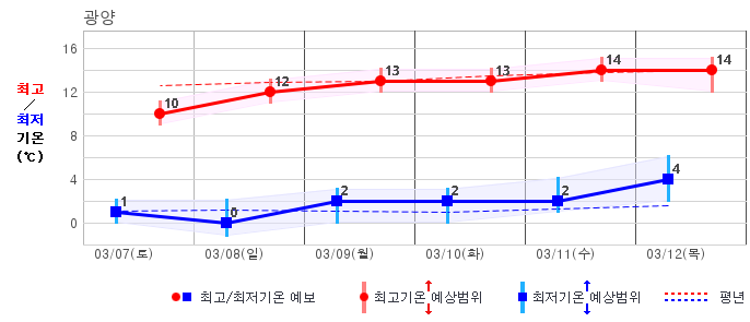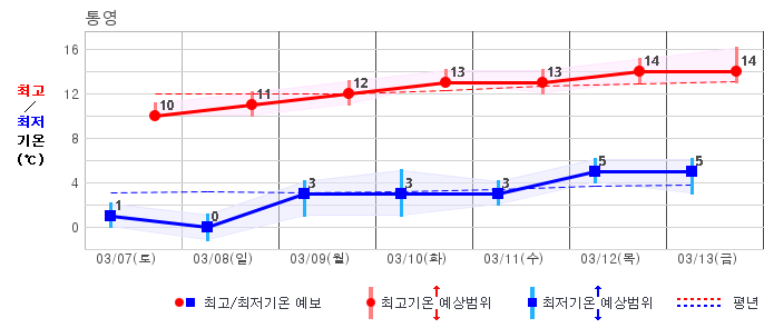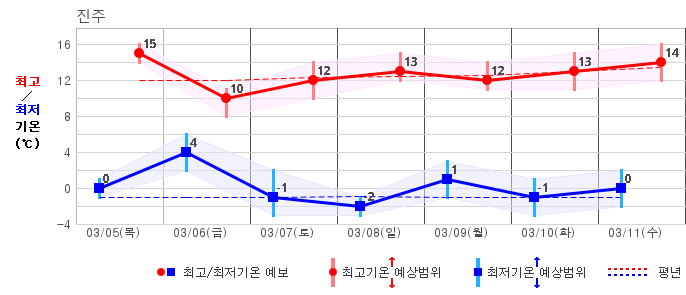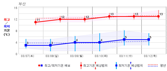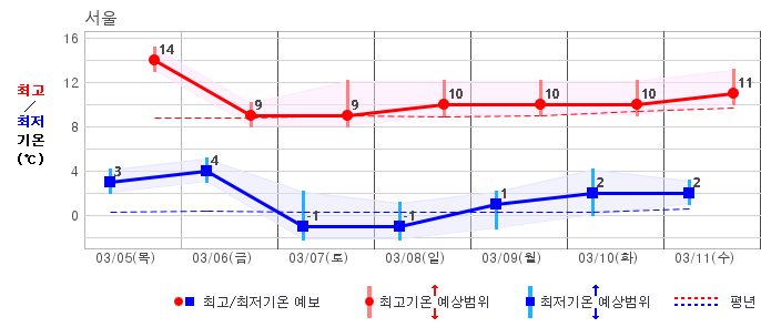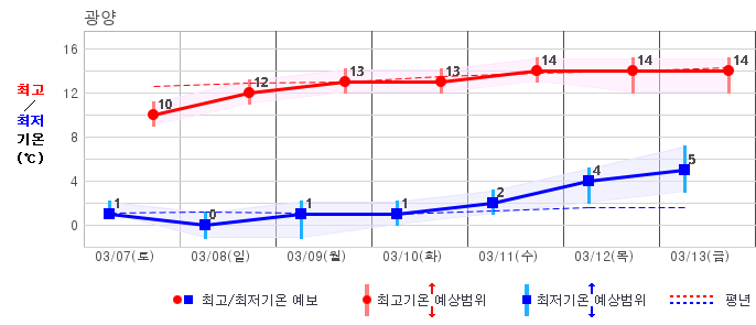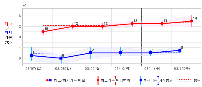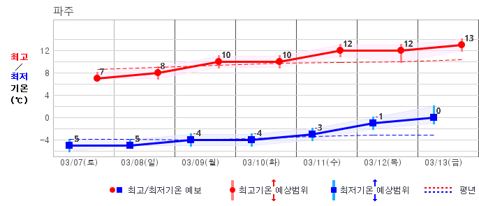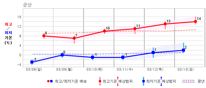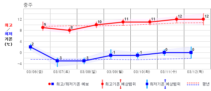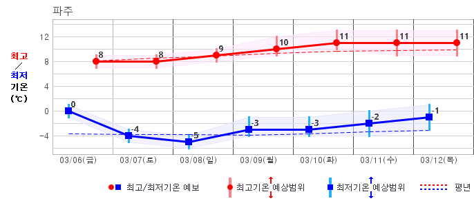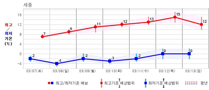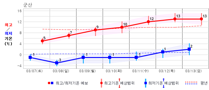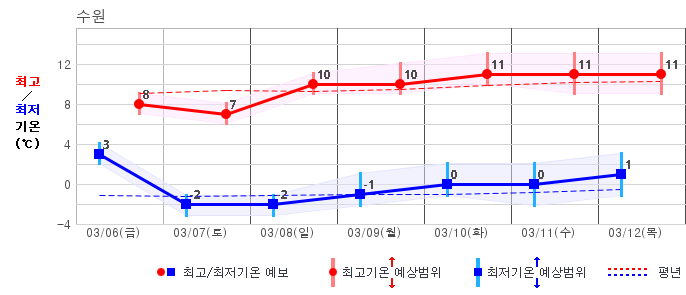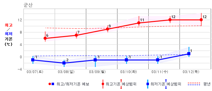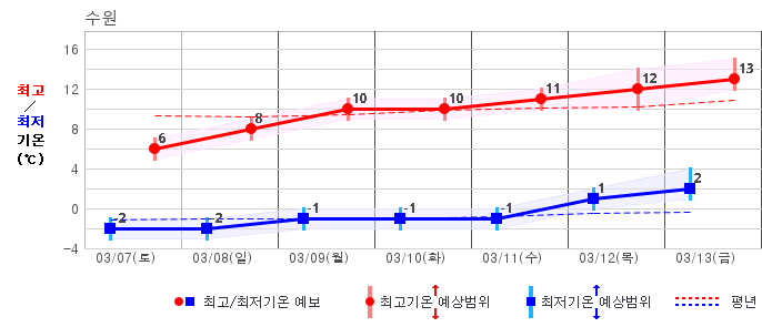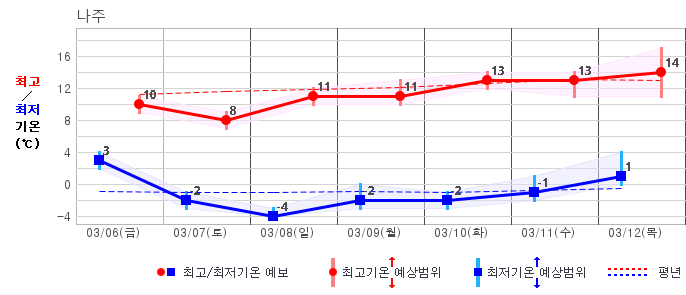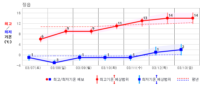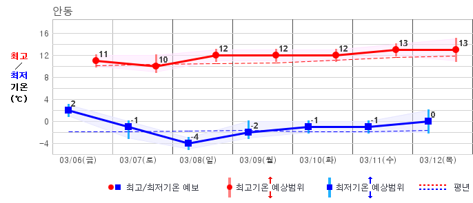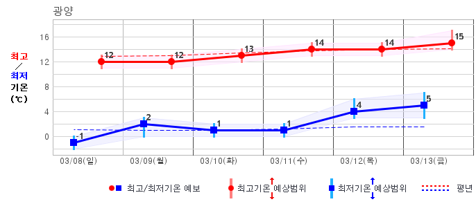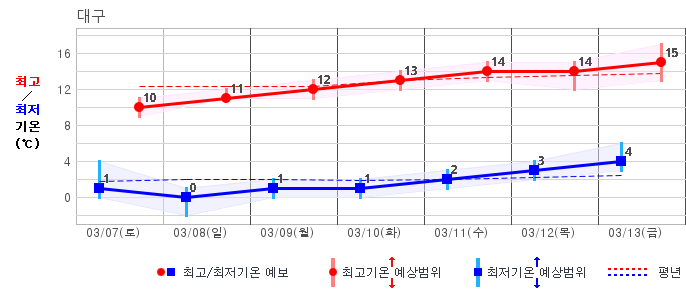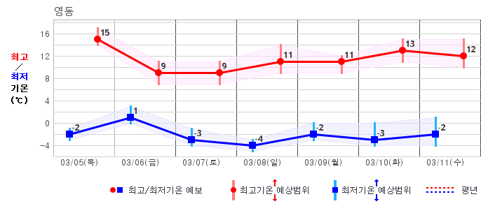 ○ (기온) 이번 예보기간 아침 기온은 -8~5℃, 낮 기온은 3~13℃로 평년(최저기온 -8~2℃, 최고기온 3~10℃)과 비슷하거나 조금 높겠습니다.