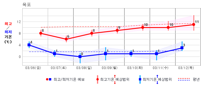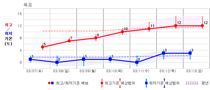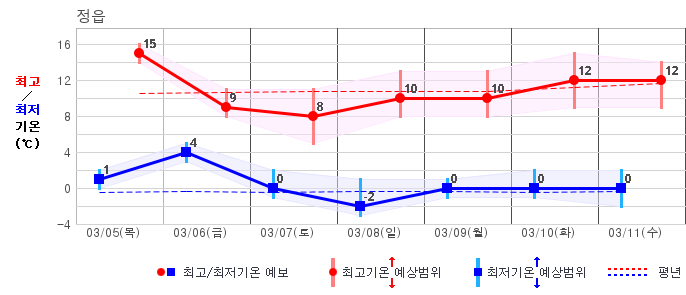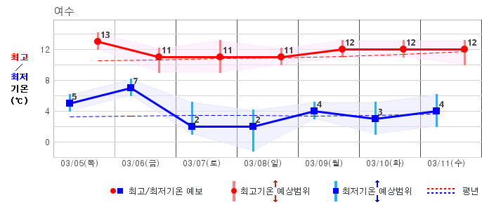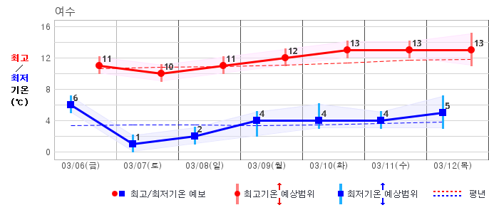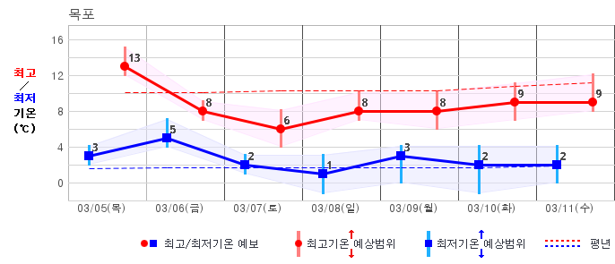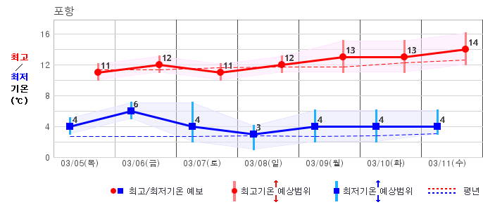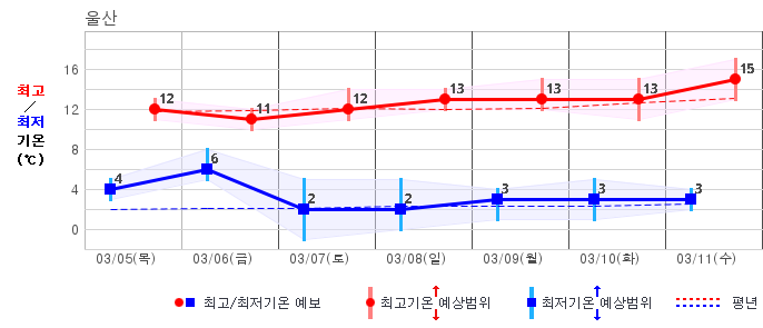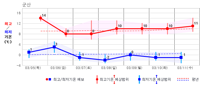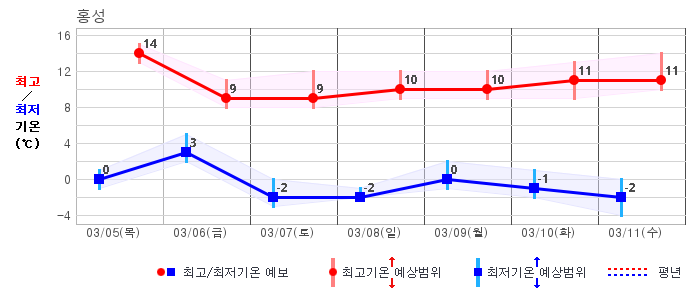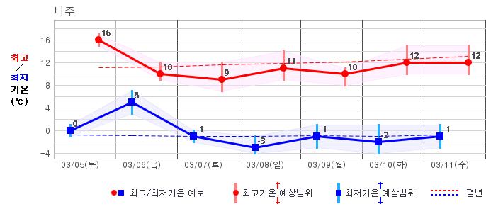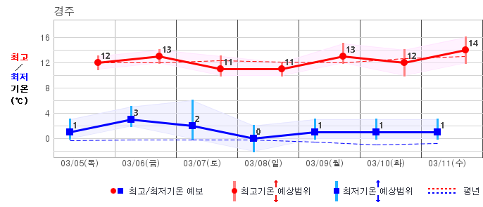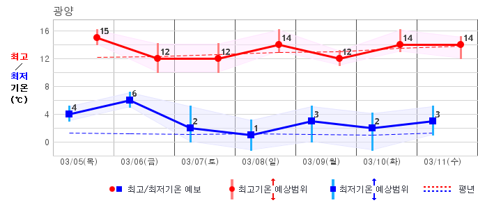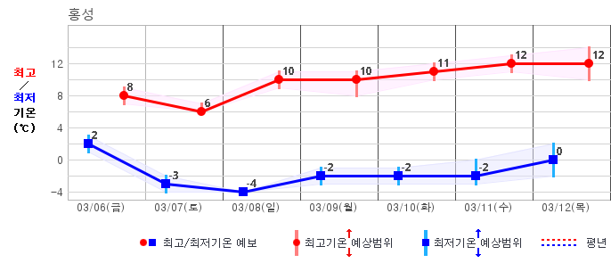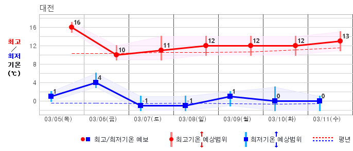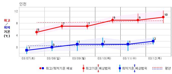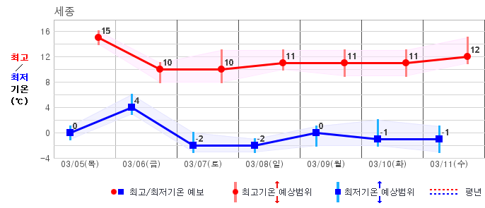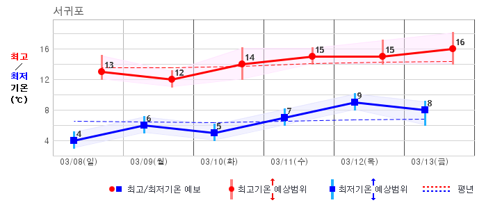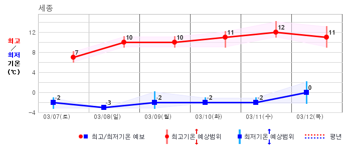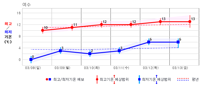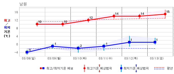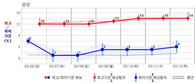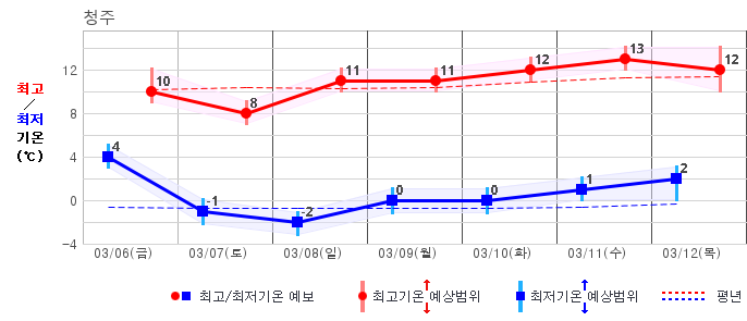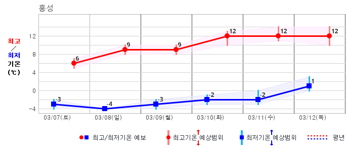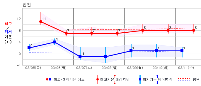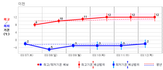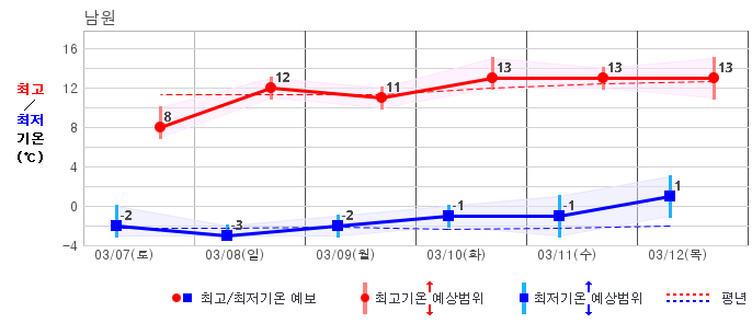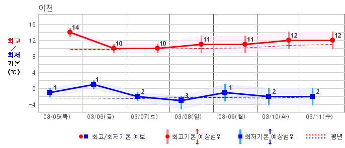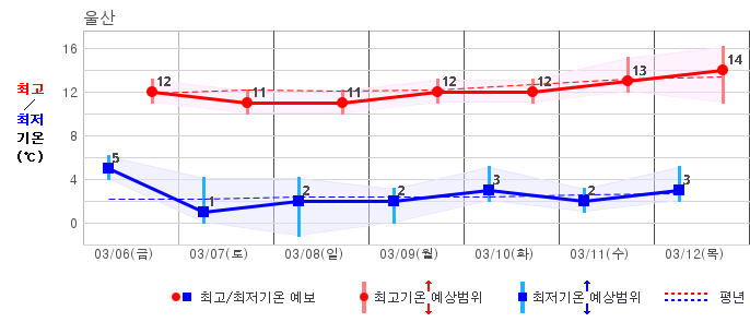 ○ (기온) 이번 예보기간 아침 기온은 -8~5℃, 낮 기온은 3~13℃로 평년(최저기온 -8~2℃, 최고기온 3~10℃)과 비슷하거나 조금 높겠습니다.