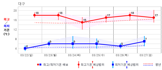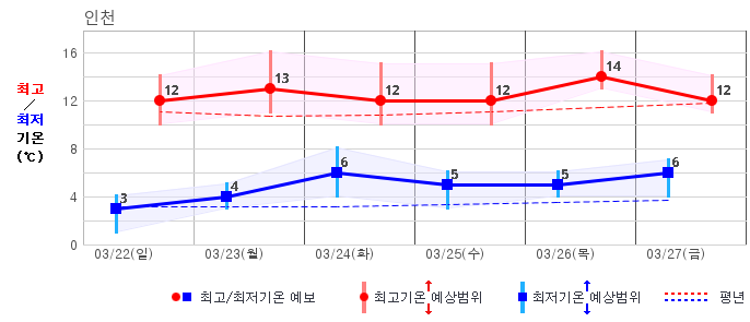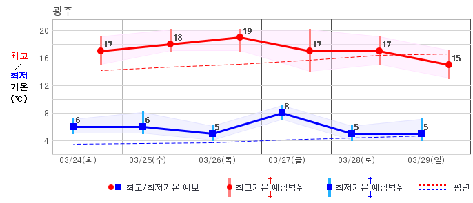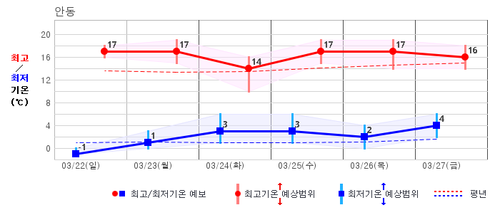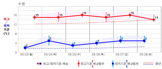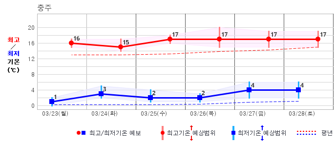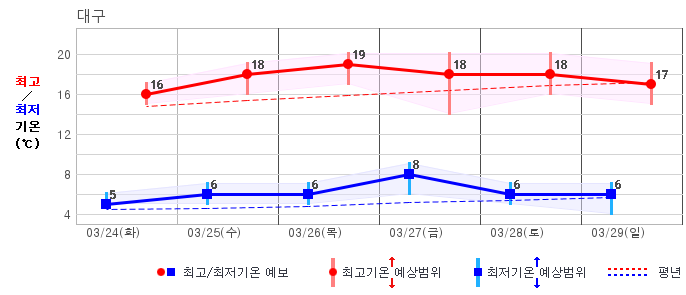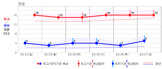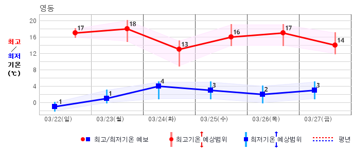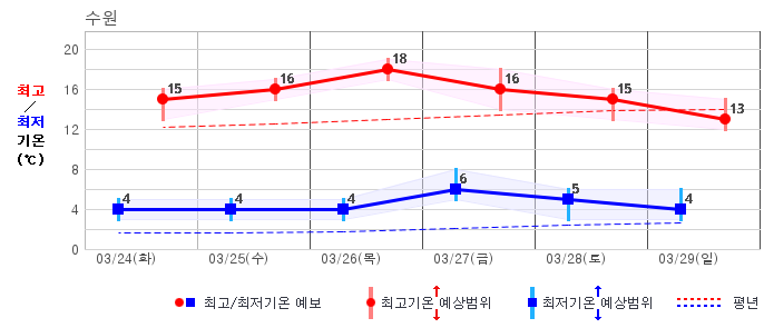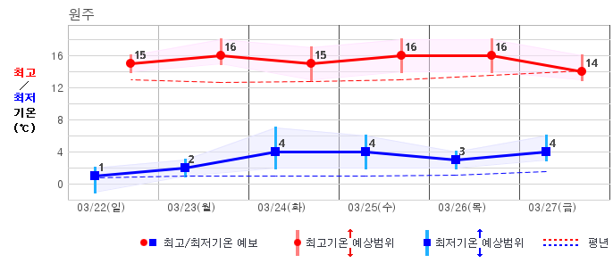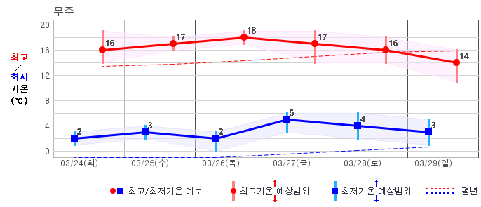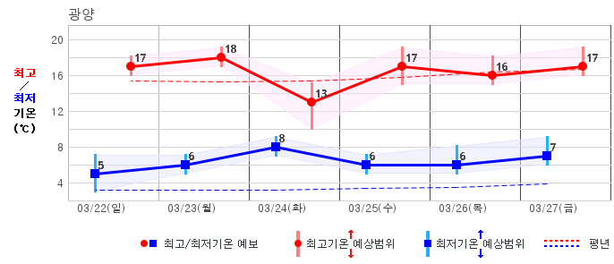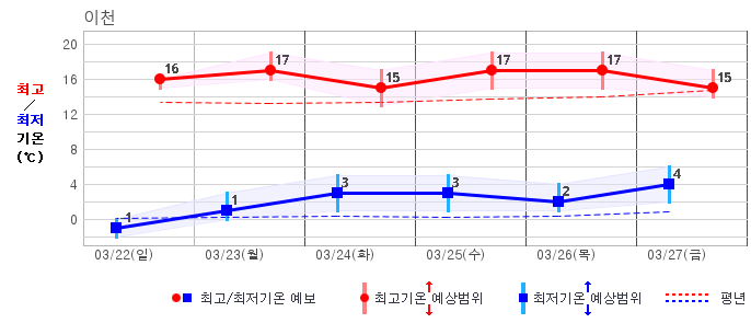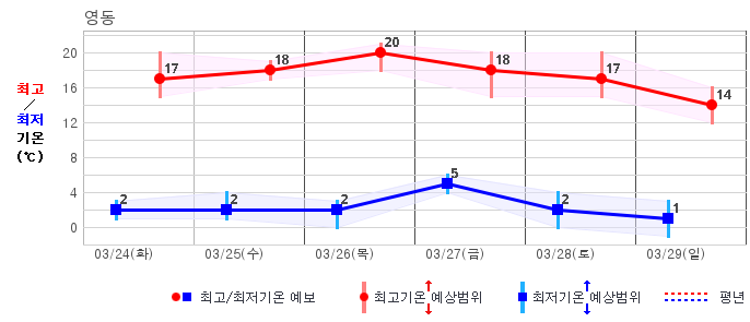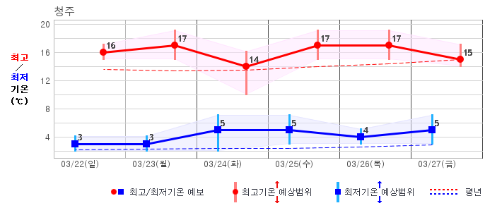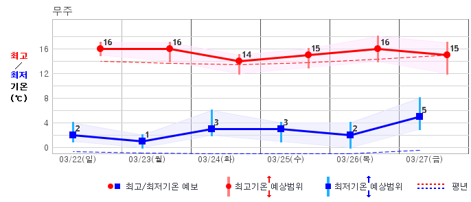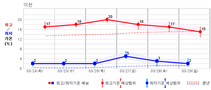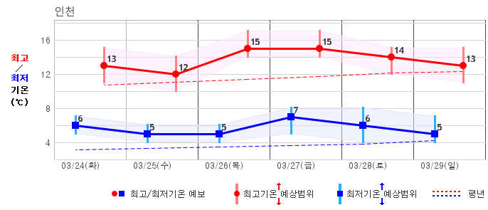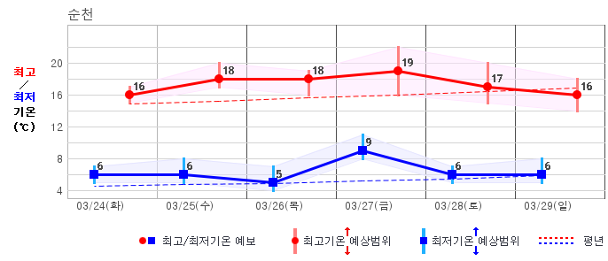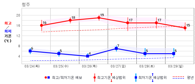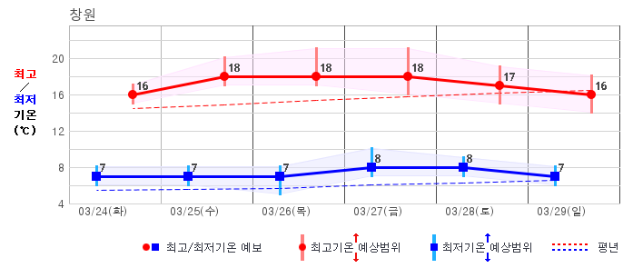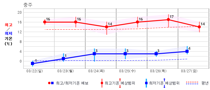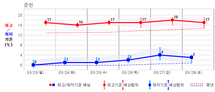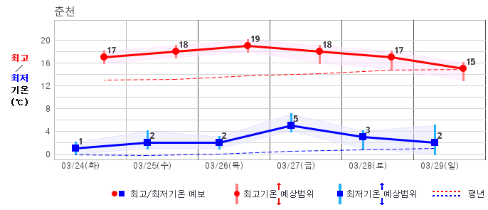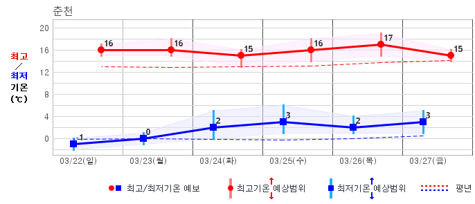 춘천 | -2 / 14 | 3 / 10 | -5 / 5 | -4 / 5 | -5 / 5 | -8 / 4 | -9 / 4 | 그래프 |