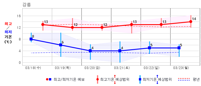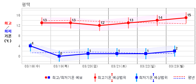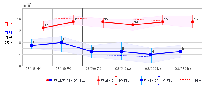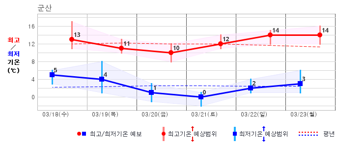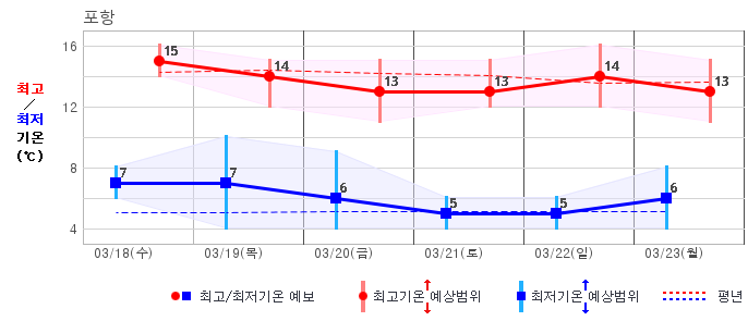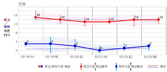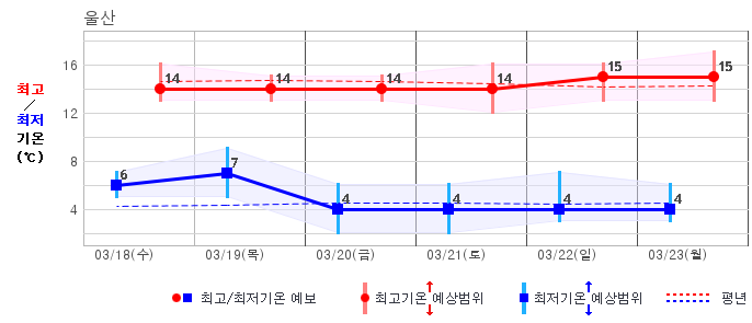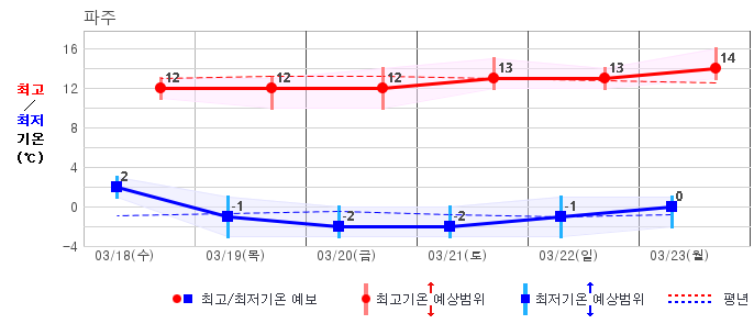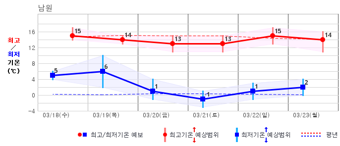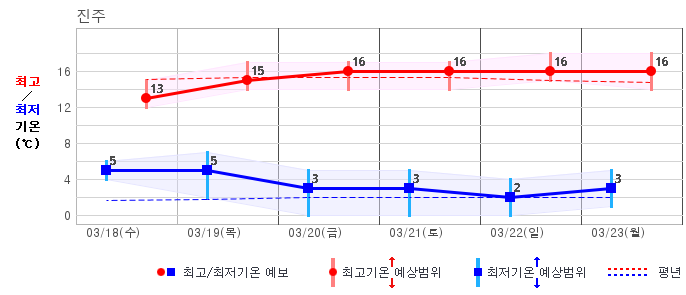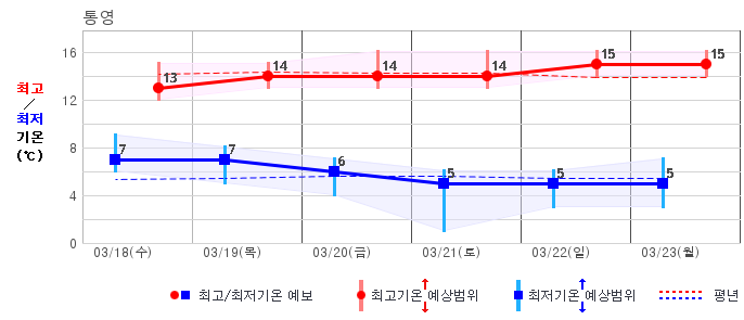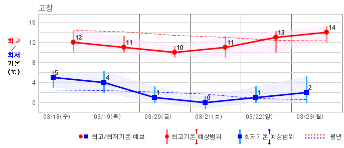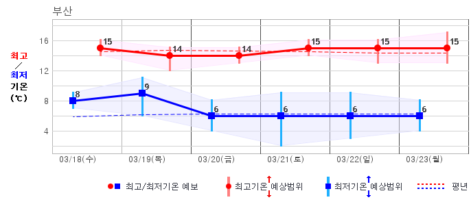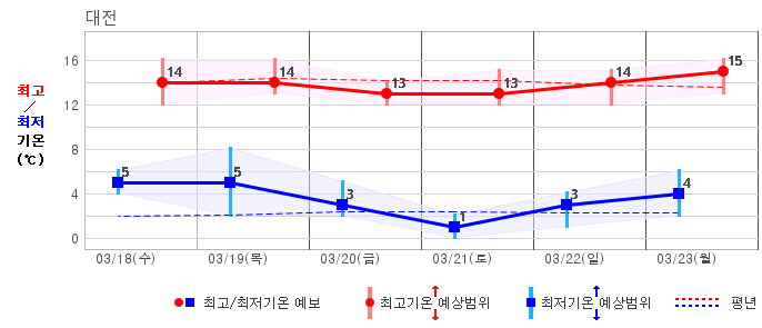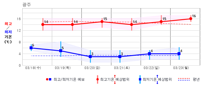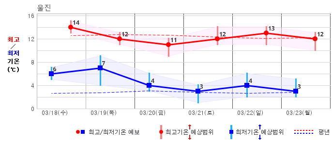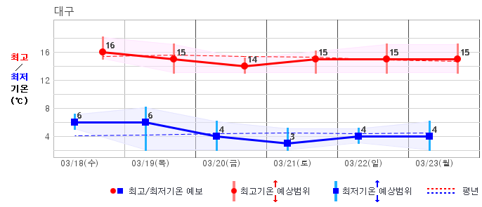 ○ (기온) 이번 예보기간의 아침 기온은 -6~8℃, 낮 기온은 5~16℃로 평년(최저기온 -5~4℃, 최고기온 6~12℃)과 비슷하거나 조금 높겠습니다.