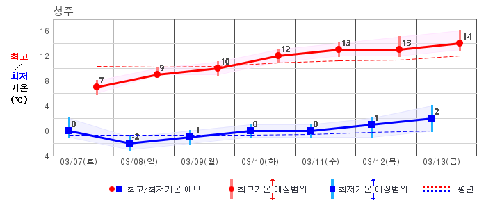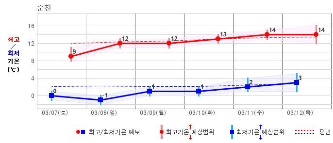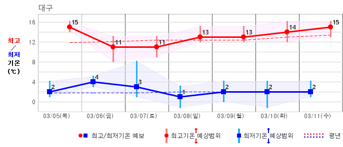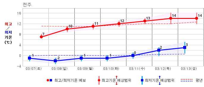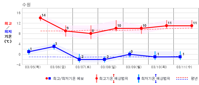 | 지역 | 14일(일) | 15일(월) | 16일(화) | 17일(수) | 18일(목) | 19일(금) | 20일(토) | ||||