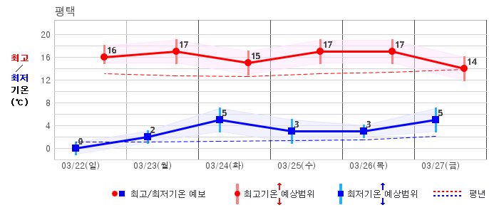 ○ (기온) 21일(토)~22일(일) 아침 기온은 -2~12℃, 낮 기온은 6~19℃로 평년(최저기온 -6~4℃, 최고기온 6~12℃)보다 높겠으나,