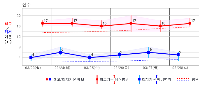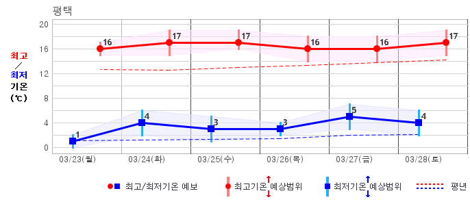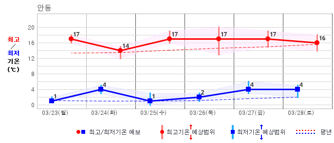 23일(월)~27일(금) 아침 기온은 -9~4℃, 낮 기온은 3~13℃로 평년과 비슷하거나 조금 낮겠습니다.