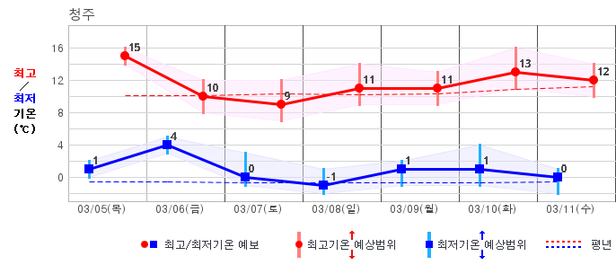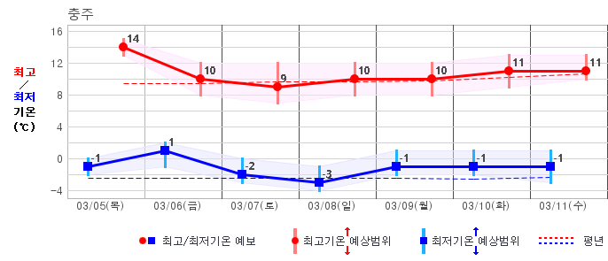 | 충청북도 | 흐림40% | 흐림20% | 맑음10% | 맑음10% | 구름많음20% | 구름많음20% | 맑음10% | 맑음10% | 맑음10% | 맑음10% | 맑음20% |