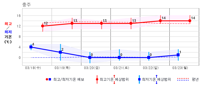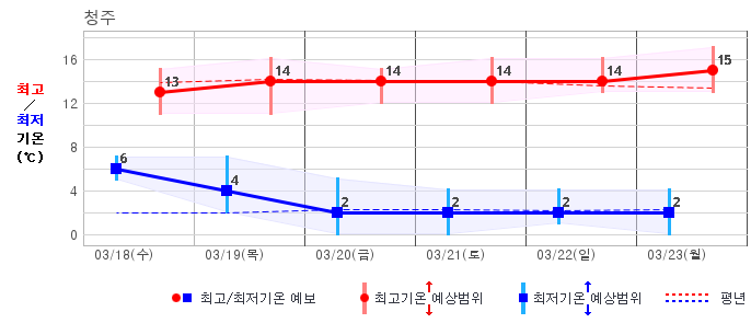 | 충청북도 | 맑음10% | 맑음30% | 흐림40% | 흐림60% | 구름많음30% | 구름많음30% | 구름많음30% | 구름많음30% | 흐림40% | 흐림40% | 구름많음30% |