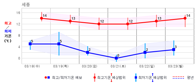 | 세종 | -5 / 8 | -1 / 6 | -3 / 7 | 0 / 10 | 4 / 14 | 5 / 13 | 4 / 14 | 그래프 | |