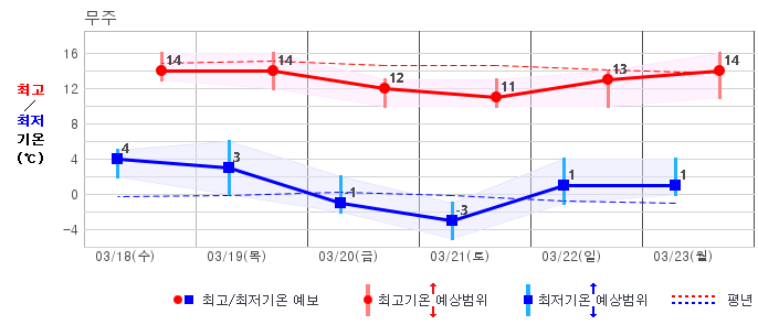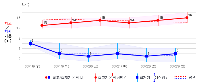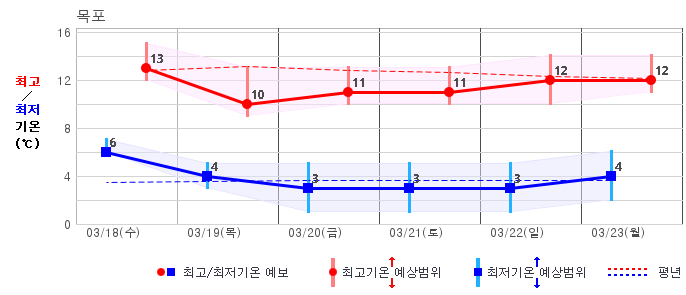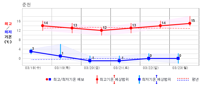 춘천 | -6 / 7 | -3 / 6 | -1 / 8 | -2 / 10 | 0 / 10 | 0 / 10 | -1 / 9 | 그래프 |