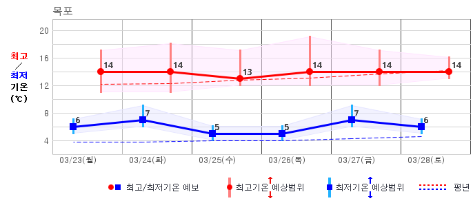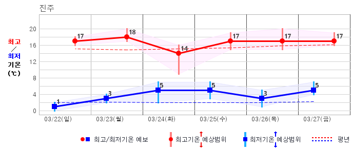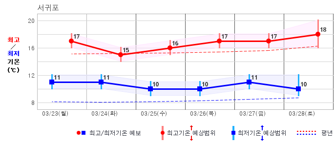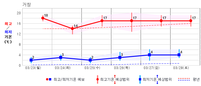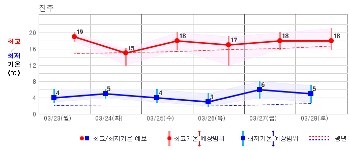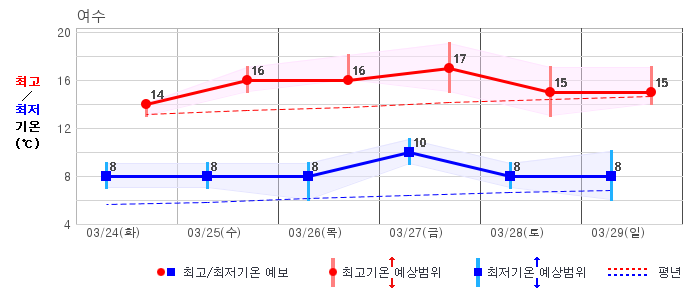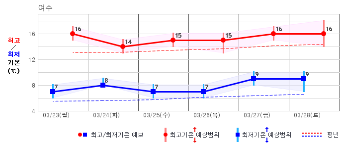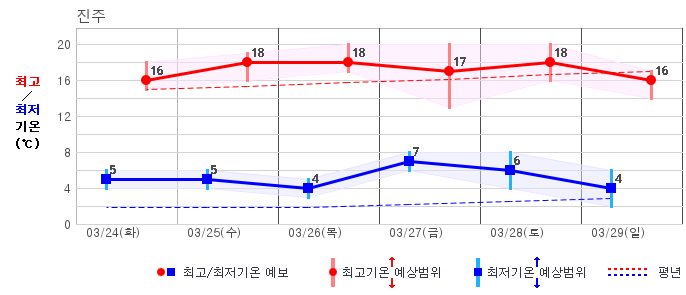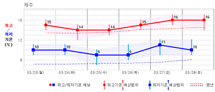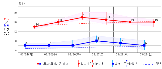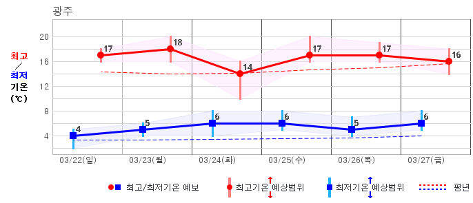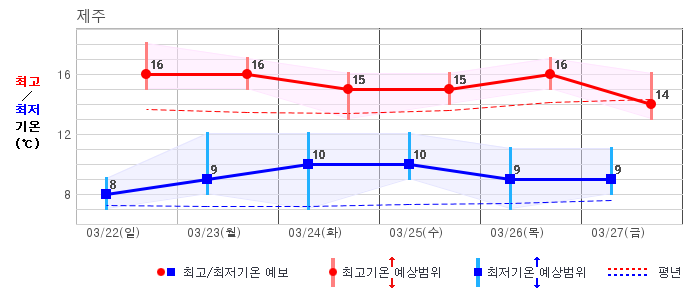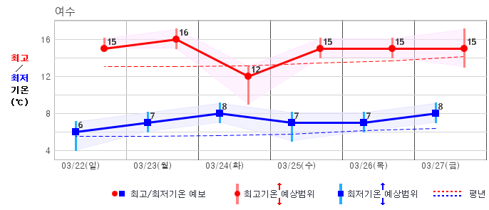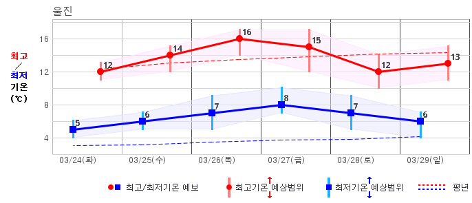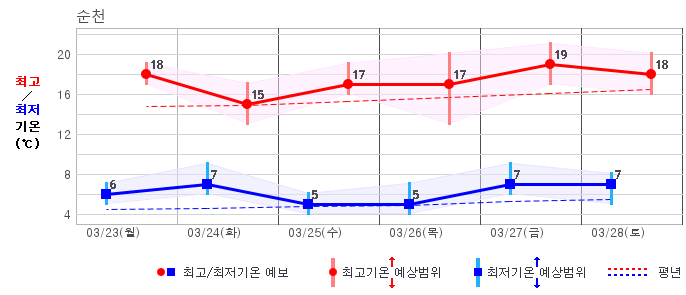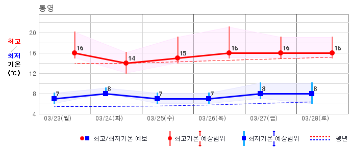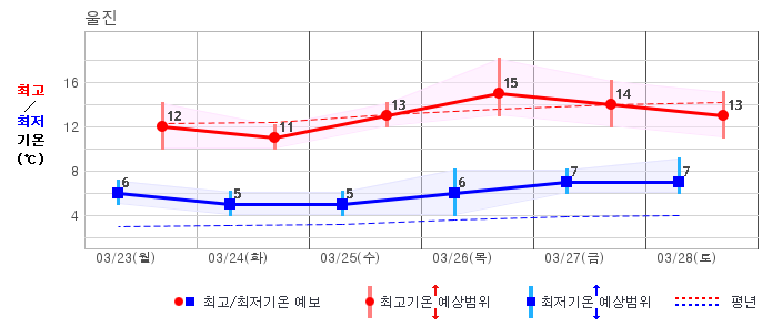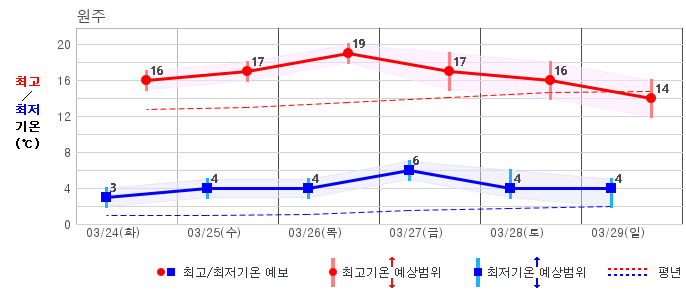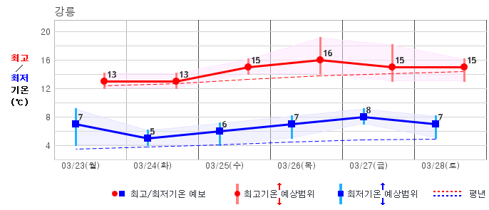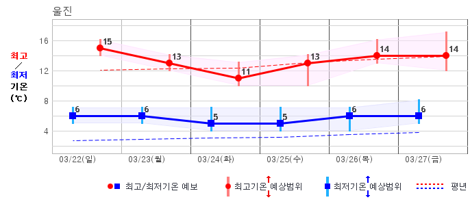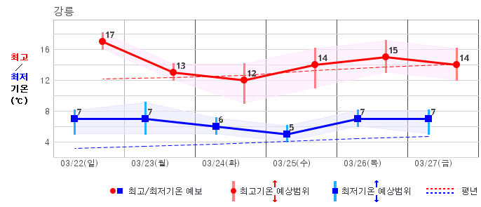 강릉 | 5 / 18 | 11 / 14 | 1 / 10 | 1 / 8 | 1 / 7 | -1 / 6 | -2 / 6 | 그래프 |