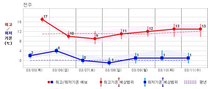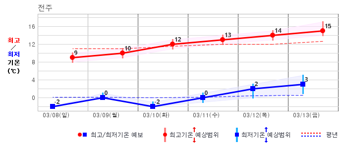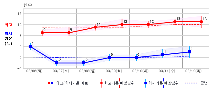 | 전북자치도 | 흐리고 비/눈80% | 흐리고 비/눈30% | 맑음10% | 맑음10% | 구름많음30% | 구름많음30% | 맑음20% | 맑음20% | 맑음10% | 맑음10% | 맑음10% |