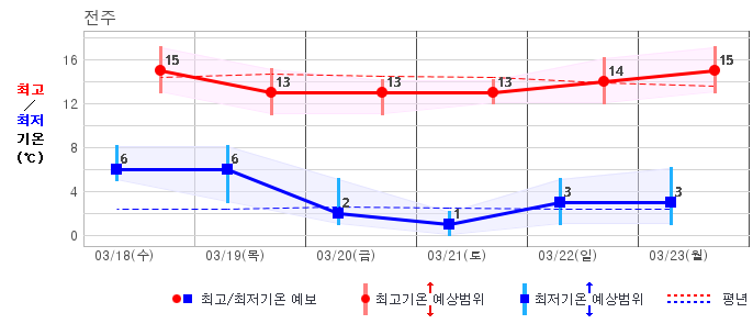 | 전북자치도 | 맑음10% | 맑음20% | 흐리고 비60% | 흐리고 비80% | 구름많음30% | 구름많음30% | 흐림40% | 흐림40% | 흐림40% | 흐림40% | 구름많음30% |
