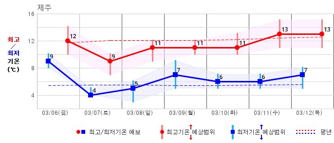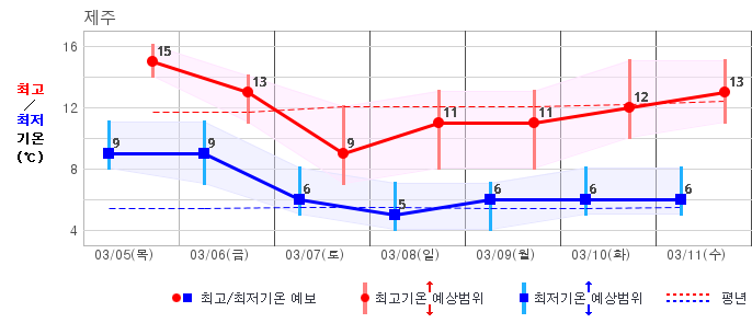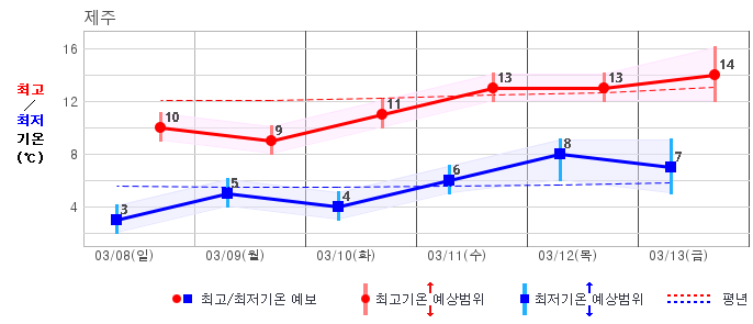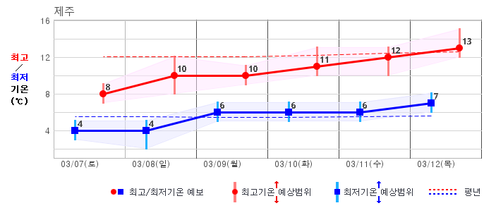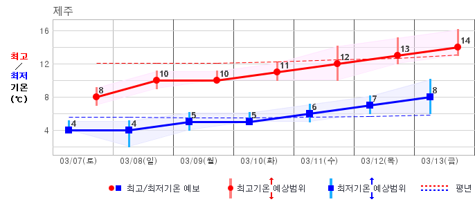 | 제주도 | 흐리고 비80% | 흐리고 비70% | 구름많음30% | 구름많음20% | 구름많음20% | 구름많음20% | 구름많음20% | 구름많음20% | 맑음20% | 맑음20% | 구름많음30% |