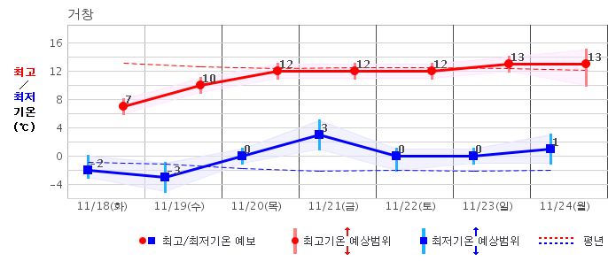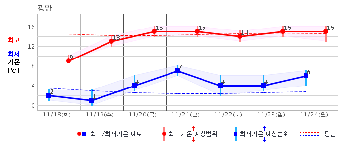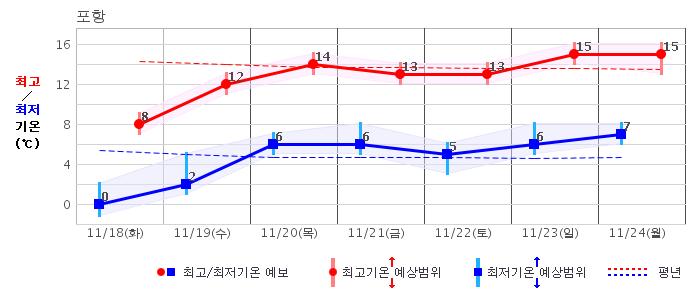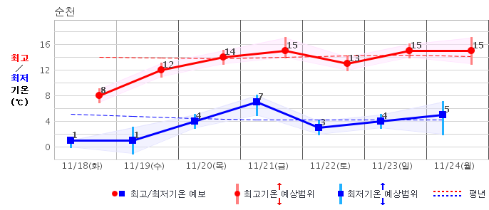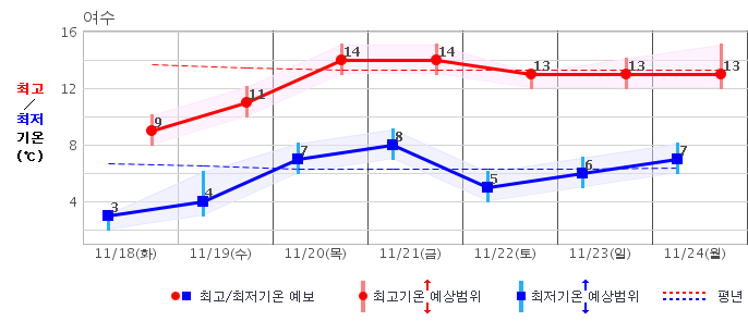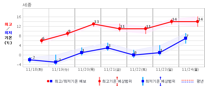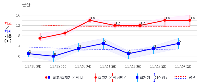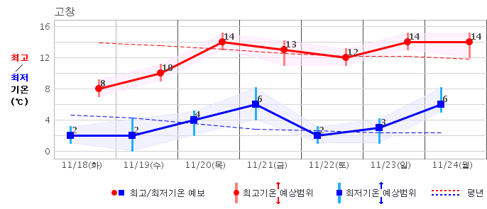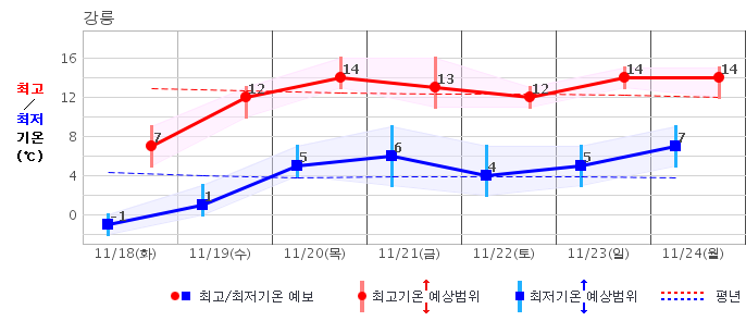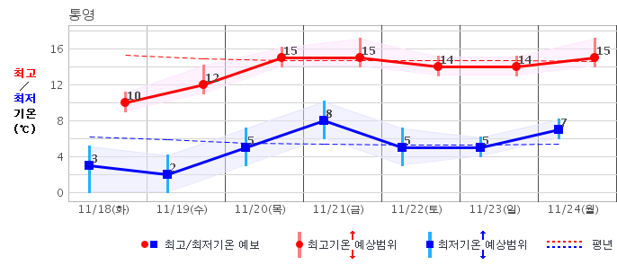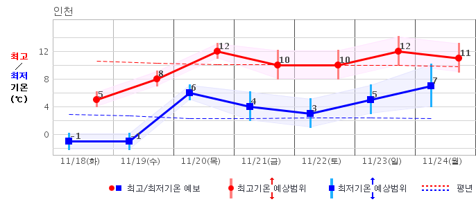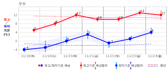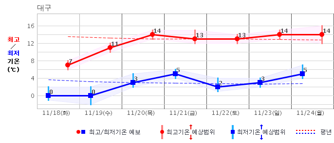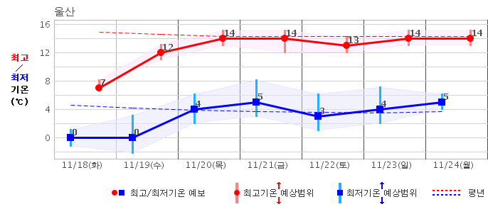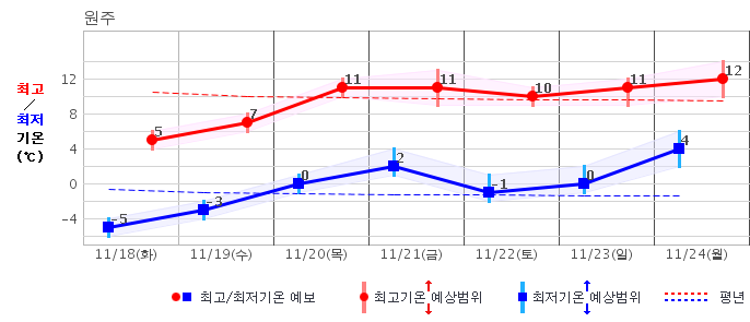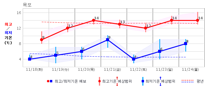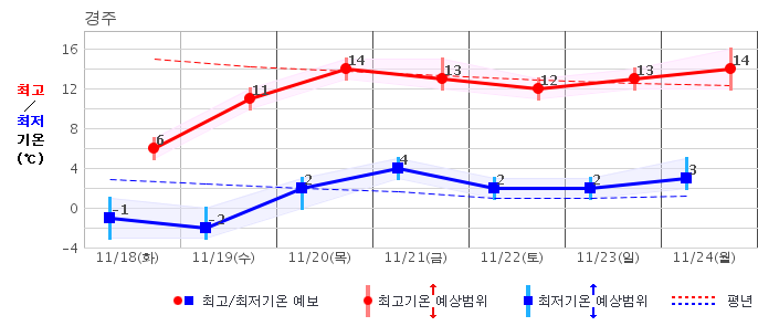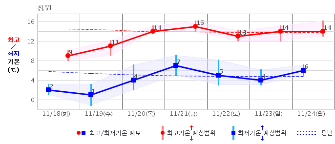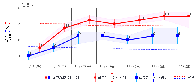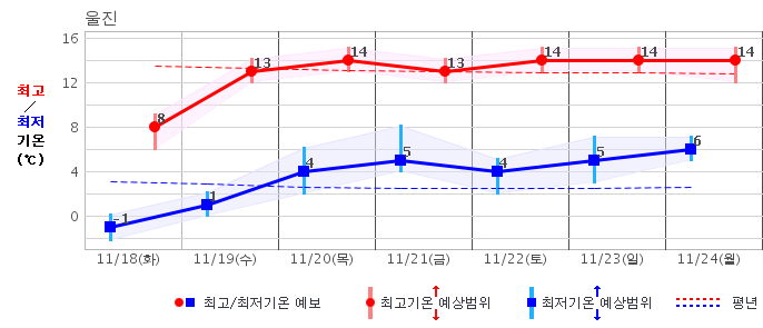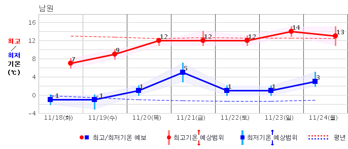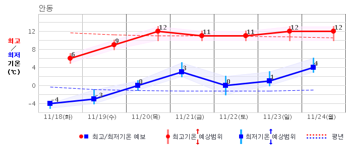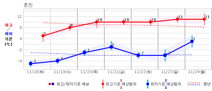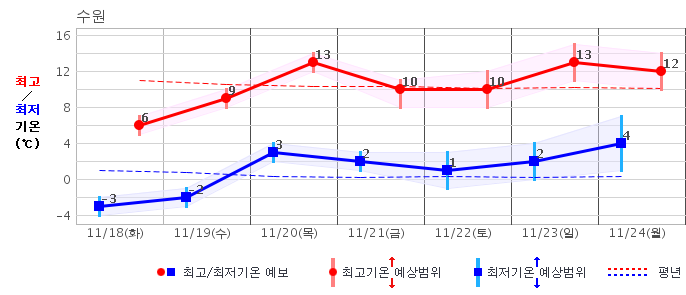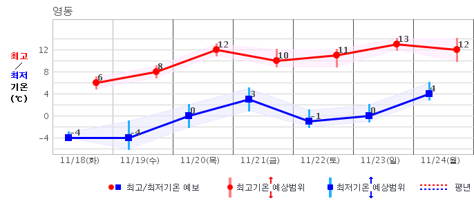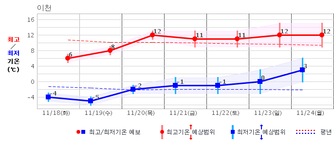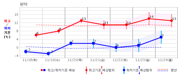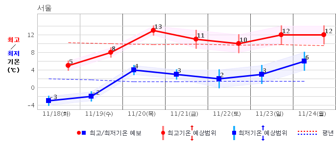 * (기온) 18일(화)~19일(수) 북쪽에서 유입되는 찬 공기의 영향으로 기온이 큰 폭으로 떨어지겠고, 바람도 강하게 불어 체감온도는 더욱 낮아지겠으니, 건강관리에 각별히 유의하기 바랍니다.