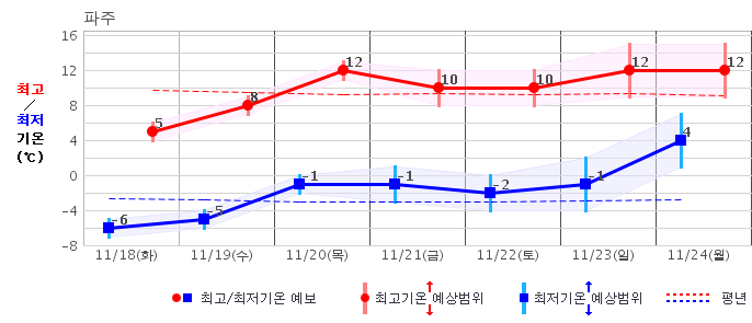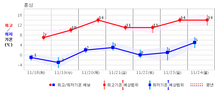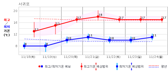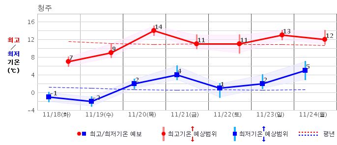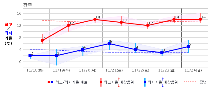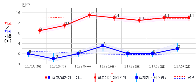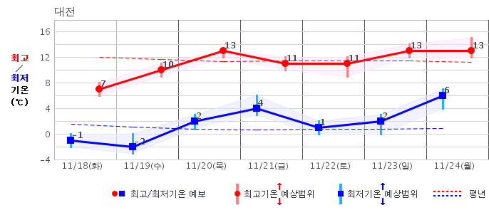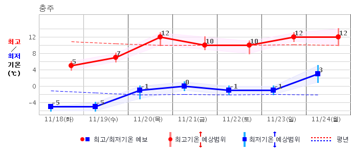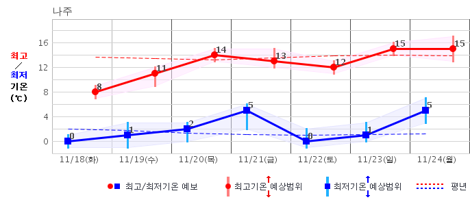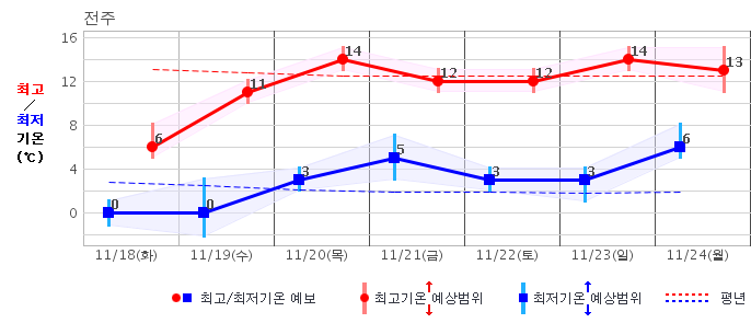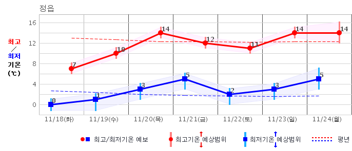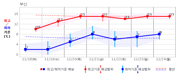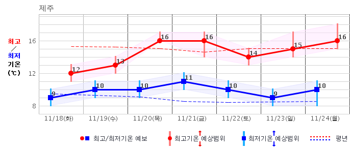 ○ (강수) 18일(화) 충남권과 전라권에 비 또는 눈이 내리겠고, 18일(화)~19일(수) 오전 제주도에 비가 내리겠습니다. ○ (기온) 18일(화)~19일(수) 아침 기온은 -5~2℃, 낮 기온은 5~13℃로 평년(최저기온 -2~7℃, 최고기온 8~15℃)보다 낮겠으나, 그 밖의 날의 아침 기온은 -2~8℃, 낮 기온은 10~15℃로 평년과 비슷하겠습니다. ○ (해상) 18일(화)~19일(수) 대부분 해상에서 바다의 물결이 1.0~4.0m로 매우 높게 일겠습니다.
